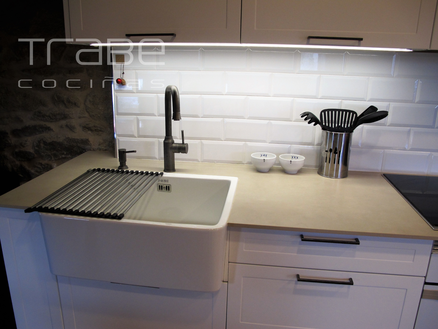 Cocina modelo Mondrián Laca en color blanco mate combinado con una encimera en material porcelánico Neolith Pietra di Osso de gran resistencia. Resalta el conjunto de fregadero de porcelana al ser combinado con grifo y dispensador acabado Manganeso. La combinación de elementos busca la personalidad de las cocinas antiguas que se ve actualizada con una estética más ligera y funcional adapada en un pequeño espacio.