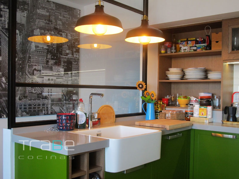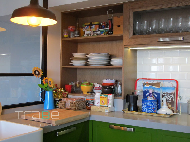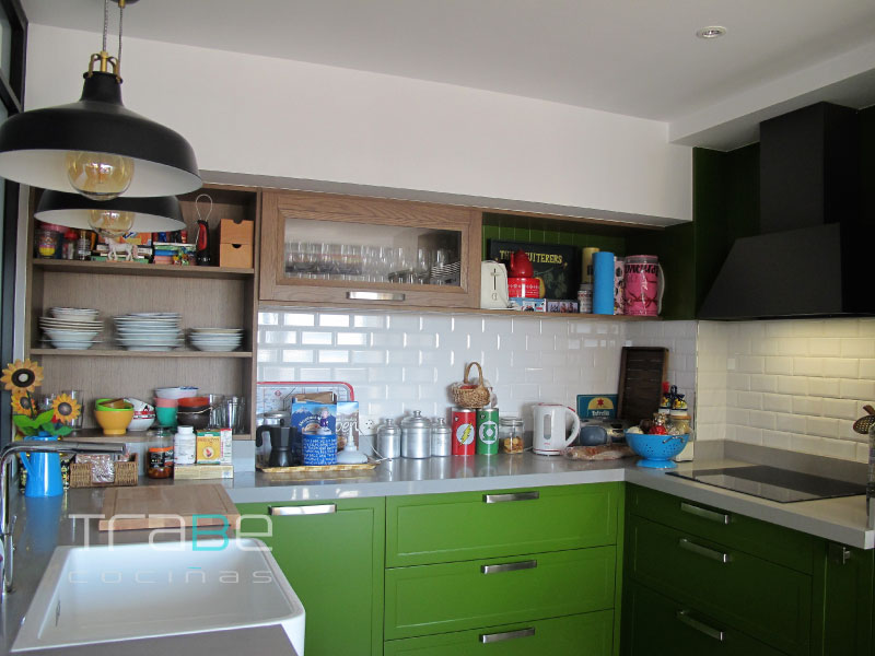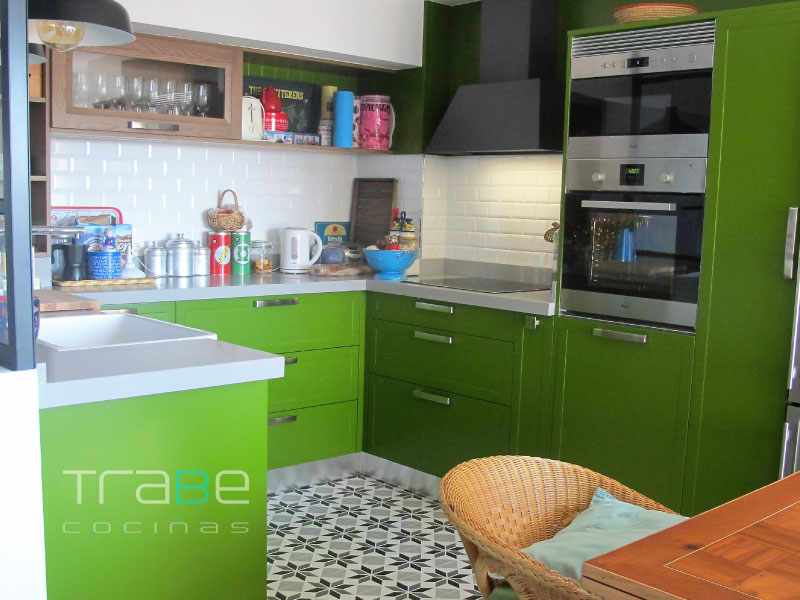 Cocina modelo Mondrián Laca en color verde mate combinado con terminaciones en madera de roble francés. La encimera en Silestone gris está combinando con el pavimento de losa hidráulica. Su diseño busca la calidez de las cocinas antiguas, en las que los accesorios complementan una estética muy personal que refleja el carácter de sus dueños.